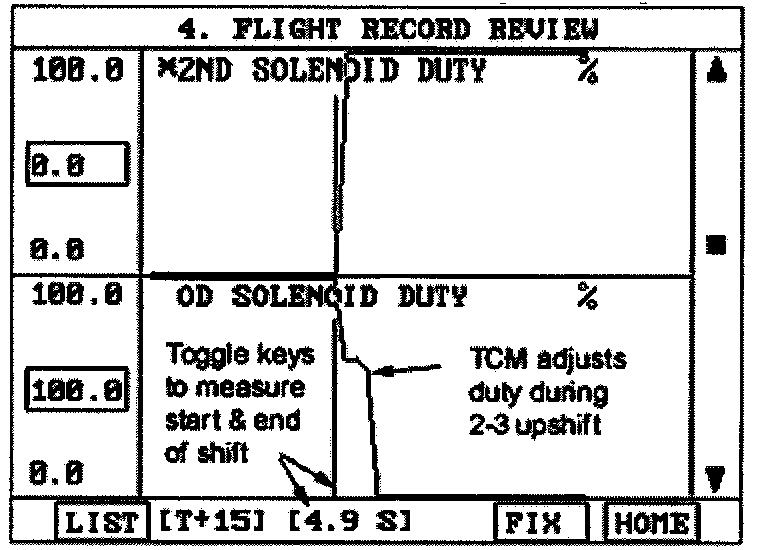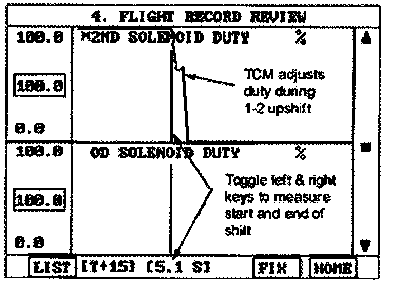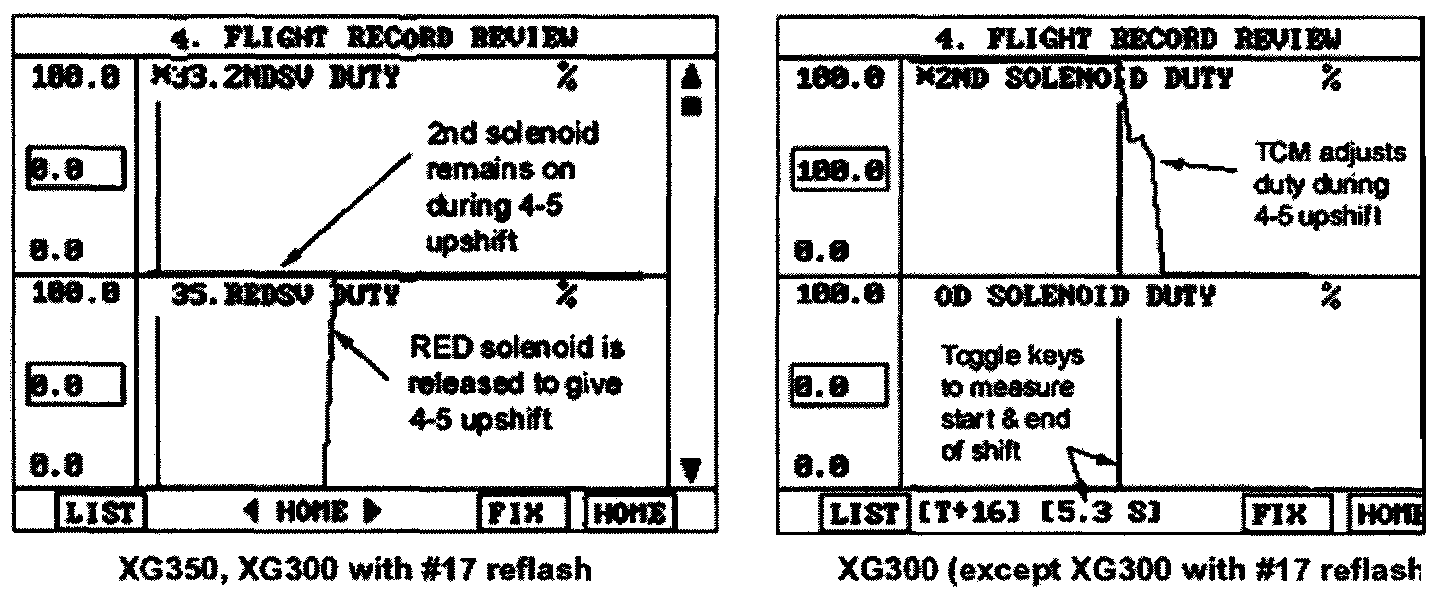 Repeat for the 4-5 upshift (for XG350, select "2nd Solenoid Duty" and "RED Solenoid Duty"). Accelerate vehicle 4-5, then F6 "END".