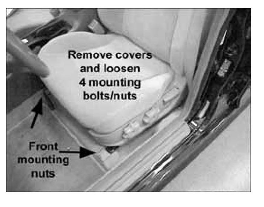 1. Remove the seat track end covers and loosen the 4 mounting bolts/nuts. Just loosen them a few turns.