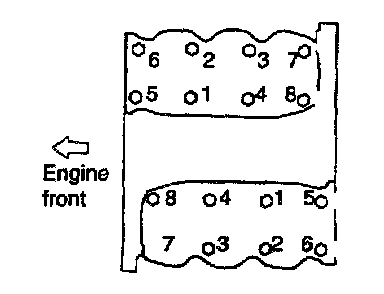 10. Install the cylinder head bolts. Starting at top center, tighten all cylinder head bolts in sequence as shown in illustration, using 12 mm socket. Repeat the procedures, tightening all cylinder head bolt to the specified torque again.