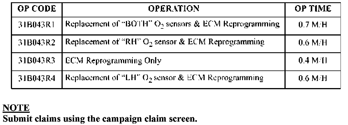 For example: For Campaign V01, the following vehicle has been identified as needing only the "RH" side oxygen sensor to be replaced and the ECM to be reprogrammed. There is no requirement to replace the "LH" side oxygen sensor. Therefore, in this example, the "LH" oxygen sensor would not be replaced.