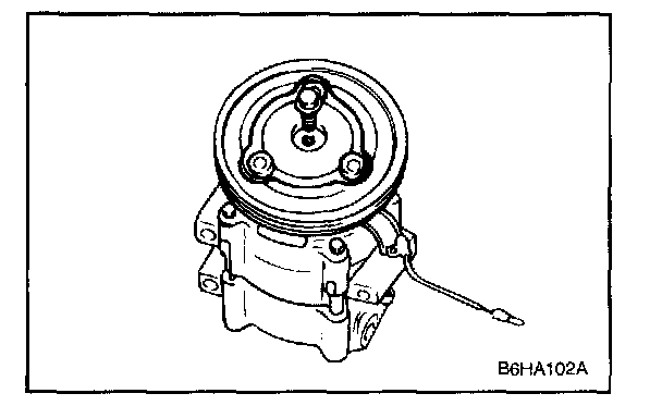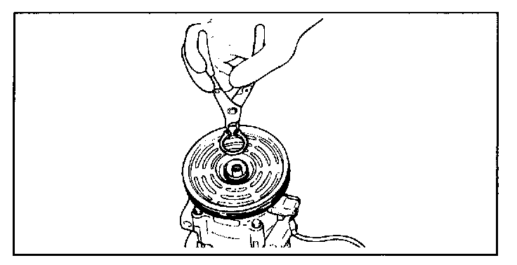 2. Pull the clutch hub and shims from the compressor shaft. If the hub cannot be pulled from the compressor shaft, screw an 8-mm bolt into the shaft hole of the clutch hub to force the hub from the shaft.