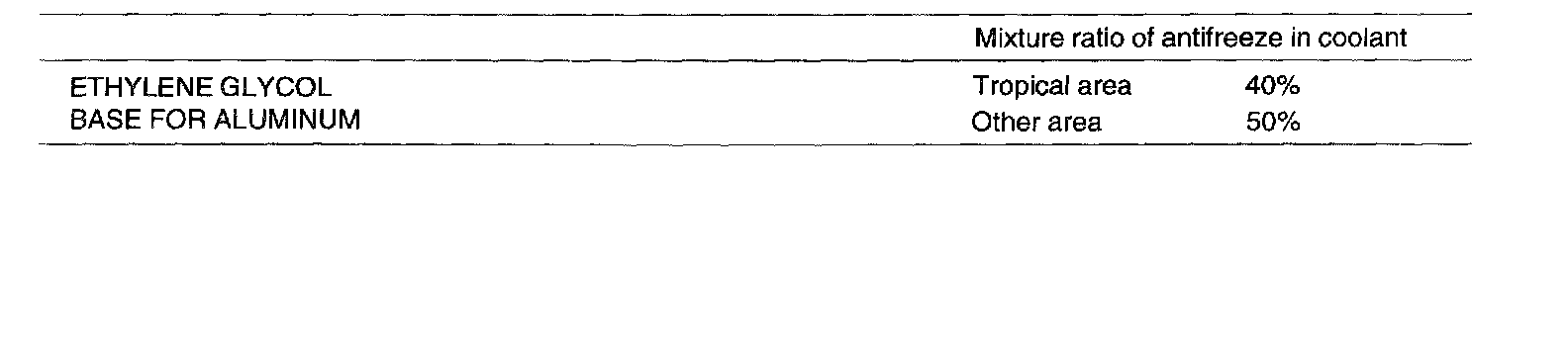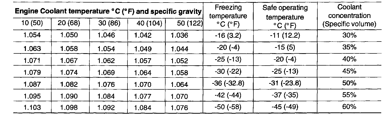 The above table is applicable only to the specified HIGH QUALITY ETHYLENE GLYCOL (ANTIFREEZE) COOLANT