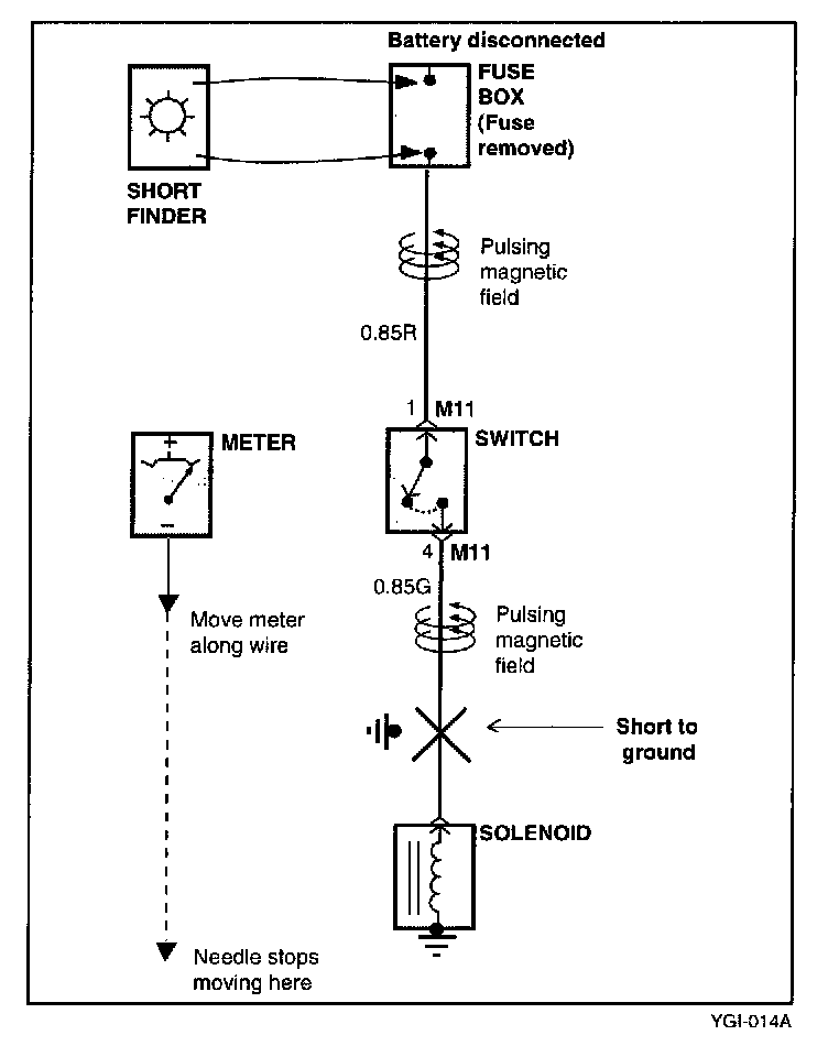 5. Beginning at the fuse box, slowly move the short finder along the circuit wiring. The meter will show current pulses through sheet metal and body trim. As long as the meter is between the fuse and the short, the needle will move with each current pulse. Once the meter is moved past the point of the short, the needle will stop moving. Check around this area to locate the cause of the short circuit.