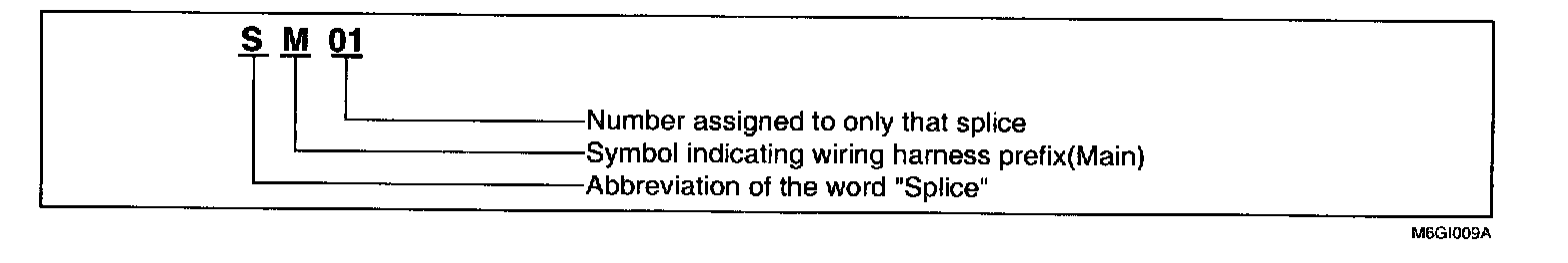 A splice identification symbol consists of a wiring harness location classification symbol corresponding to each wiring harness location and number corresponding to the splice. These splice locations can be found in the HARNESS LAYOUTS.For example: