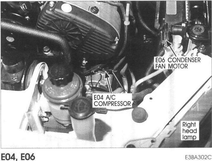 E04 A/C Compressor, E06 Condenser Fan Motor: