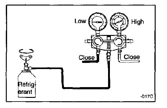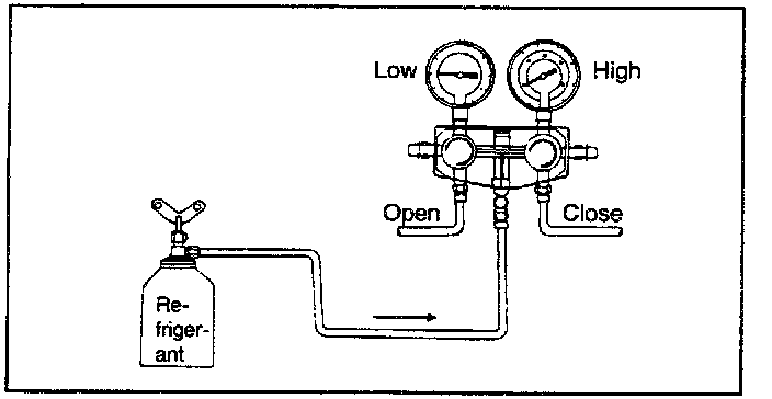 NOTE: This step is to charge the system through the low pressure side with refrigerant in a vapor state. When the refrigerant container is placed right side up, refrigerant will enter the system as a vapor1. Open the low pressure valve. Adjust the valve so that the low pressure gauge does not read over 412 kPa (4.2 kg/sq.cm, 60 psi).