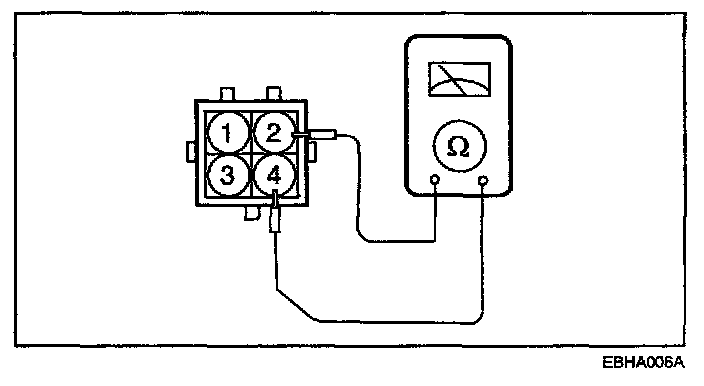 Measure the resistance between connector terminals 1 and 2 (the coils at the No. 3 and No. 6 cylinder sides) of the ignition coil, and between terminals 2 and 4 (the coils at the No. 1 and No. 4 cylinder sides), and between terminals 2 and 3 (the coils at the No.2 and No.5 cylinder sides).