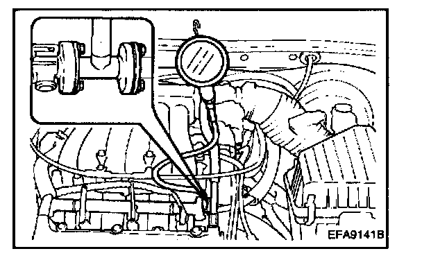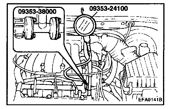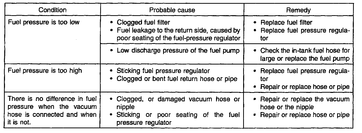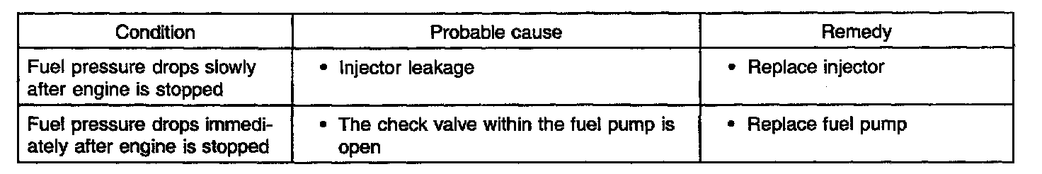 10. Stop the engine and check for a change in the fuel pressure gauge reading, which should hold for approximately 5 minutes. If the gauge indication drops, observe the rate at which it drops. Determine and remove the causes according to the table shown.