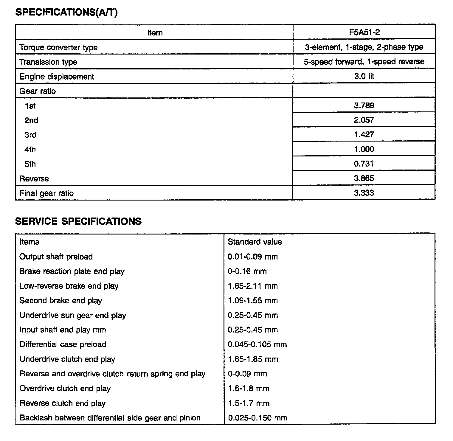 F5A51 5-spd A/T, Transmission Gear Ratios & Standard Values: