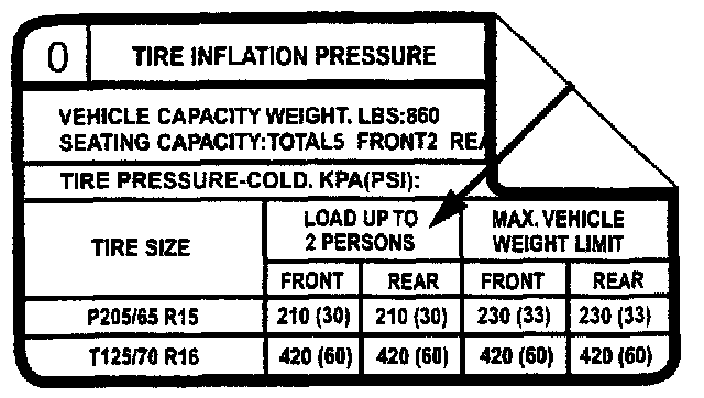 3. If the label does not contain the information for the "P205/60R16" tire size, carefully remove it from the driver side door. Remove it by peeling the label from a top corner, pulling it downward at an angle toward the other side. Pull with the label folded back 180° on itself.