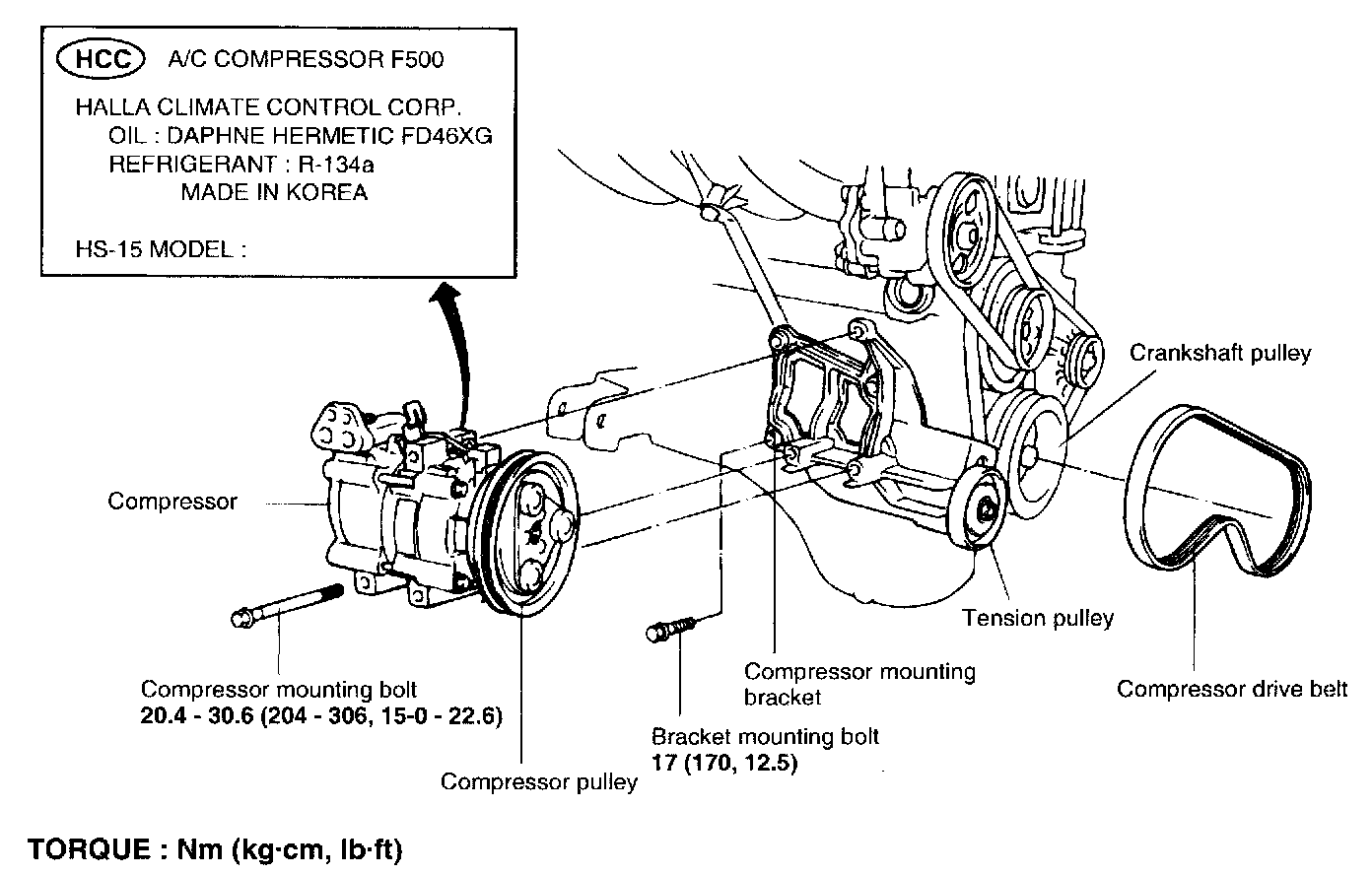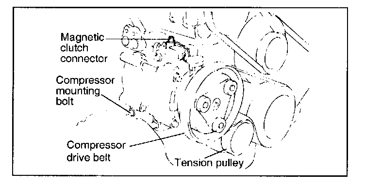 4. Loosen the tension pulley and then remove the compressor drive belt.
