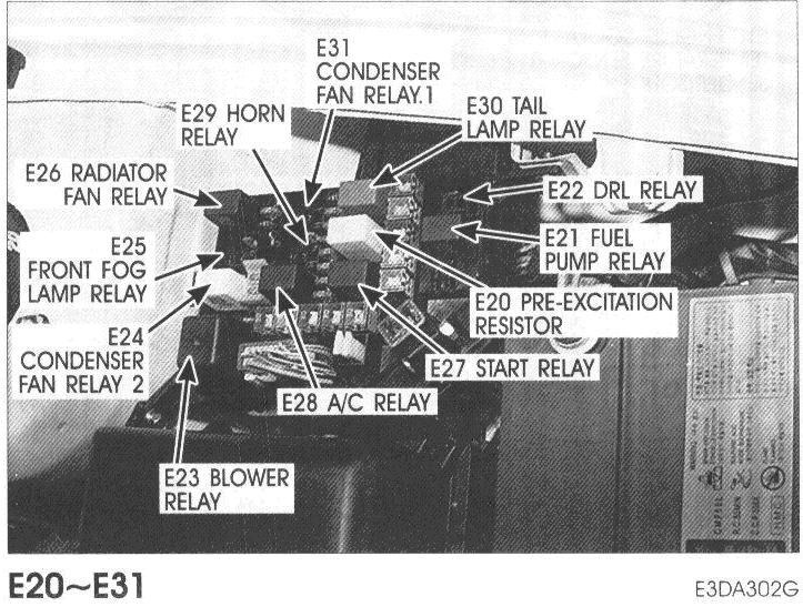 E20-Pre-Excitation Resistor, E21-DRL Relay, E23-Blower Relay, E24-Condenser Fan Relay.2, E25-Front Fog Lamp Relay, E26-Radiator Fan Relay, E27-Starter Relay, E28-A/C Relay, E29-Horn Relay, E30-Tail Lamp Relay, E31-Condenser Fan Relay.1: