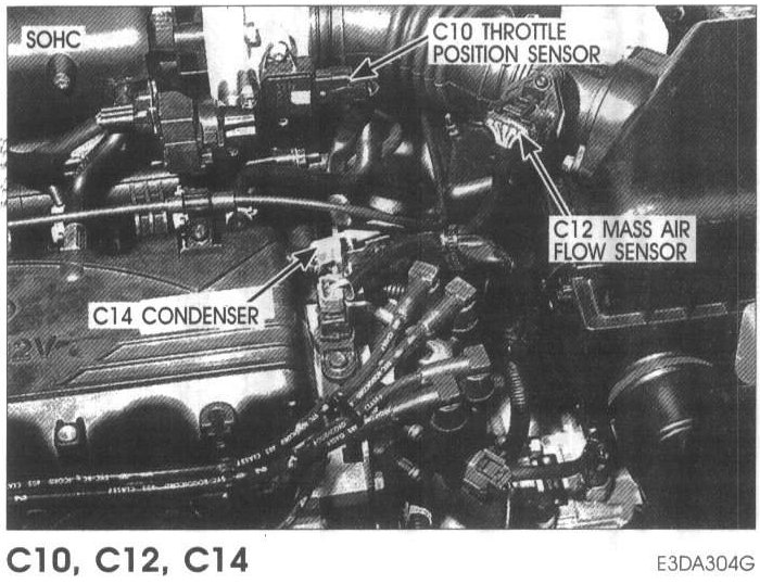 C10 Throttle Position Sensor, C12 Mass Air Flow Sensor, C14 Condenser: