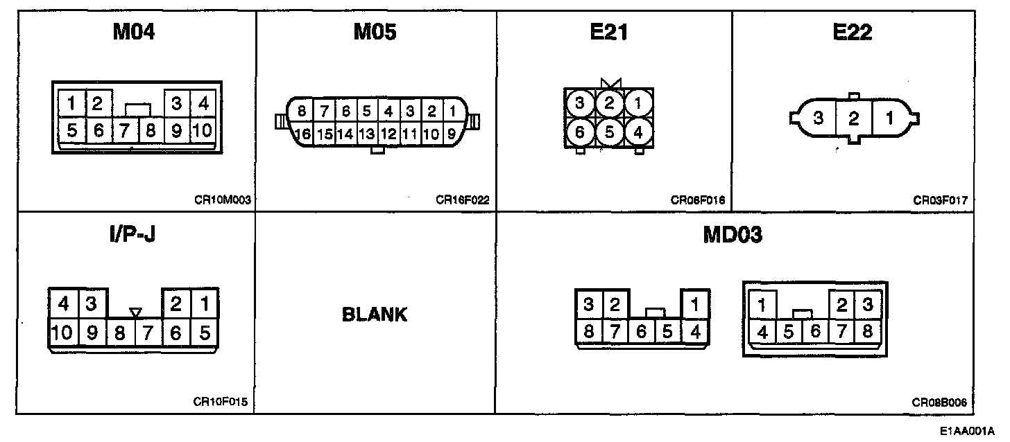 This section shows the cavity or terminal locations in all the multi-pin connectors shown in the schematic diagrams. It will help you to locate check points, together with the wire colors and terminal numbers in the schematic. The configuration drawings show the connector view as seen from a component after the harness connector has been disconnected. When more than one connector is connected to a component, the connectors are all shown together. Both halves of in-line connectors are shown together.