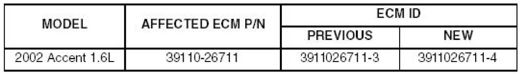The vehicles affected are all 2002 1.6L Accents produced before February 2, 2002.