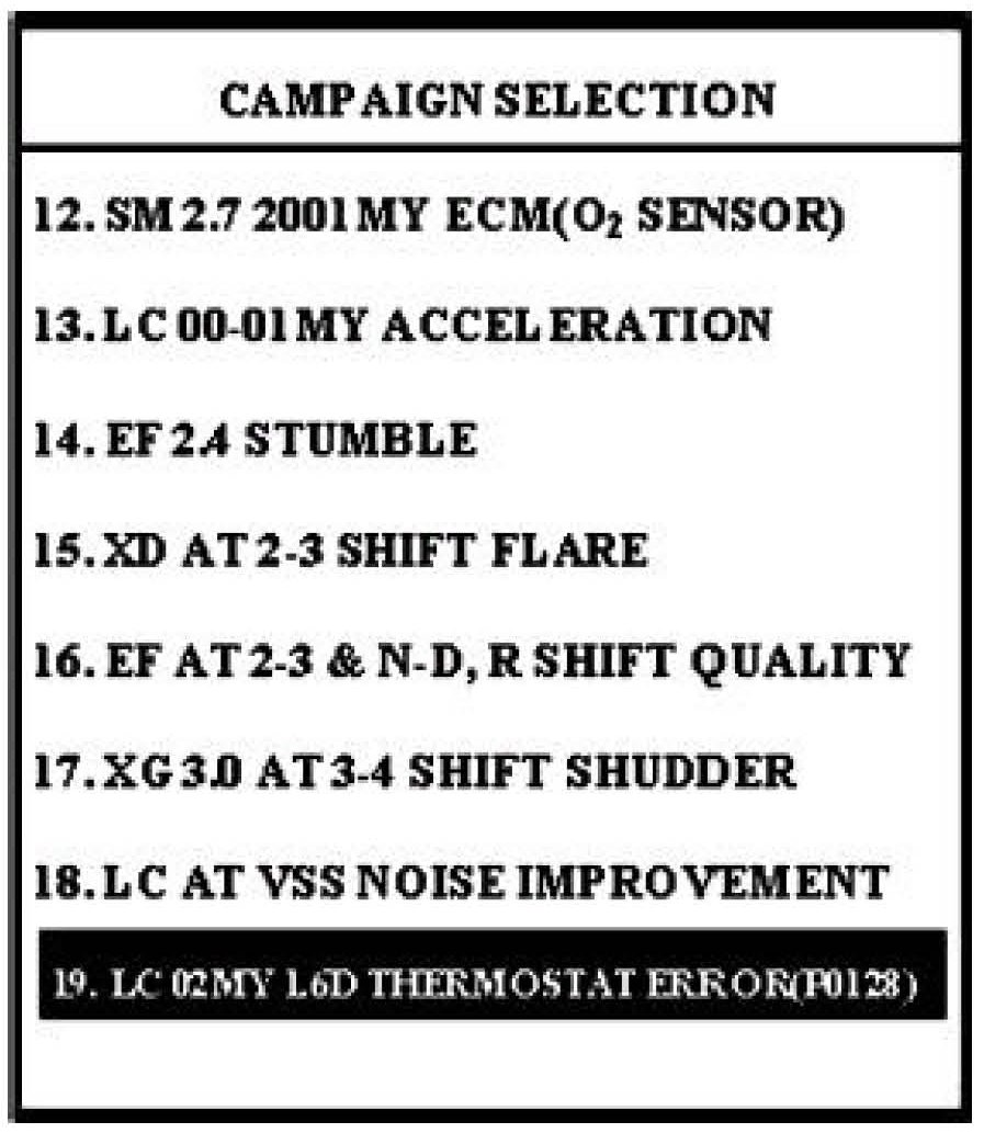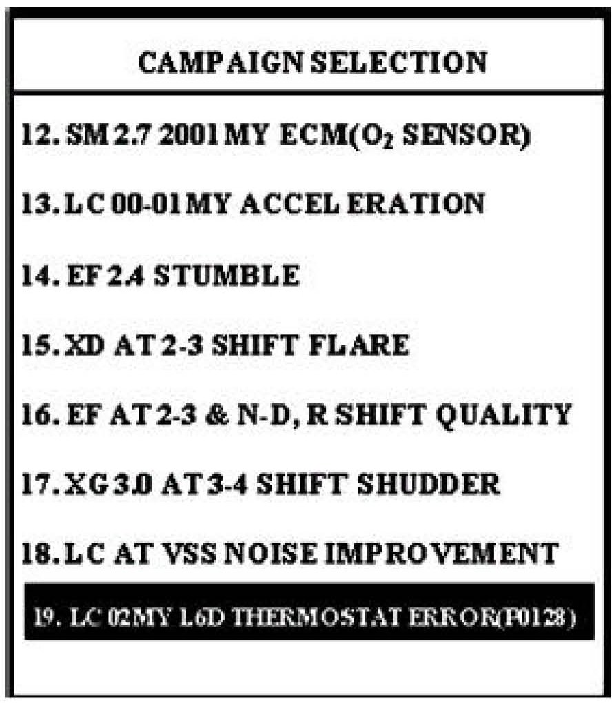 6. Select option "19. LC 02MY 1.6D THERMOSTAT ERROR(P0128)" and press ENTER.