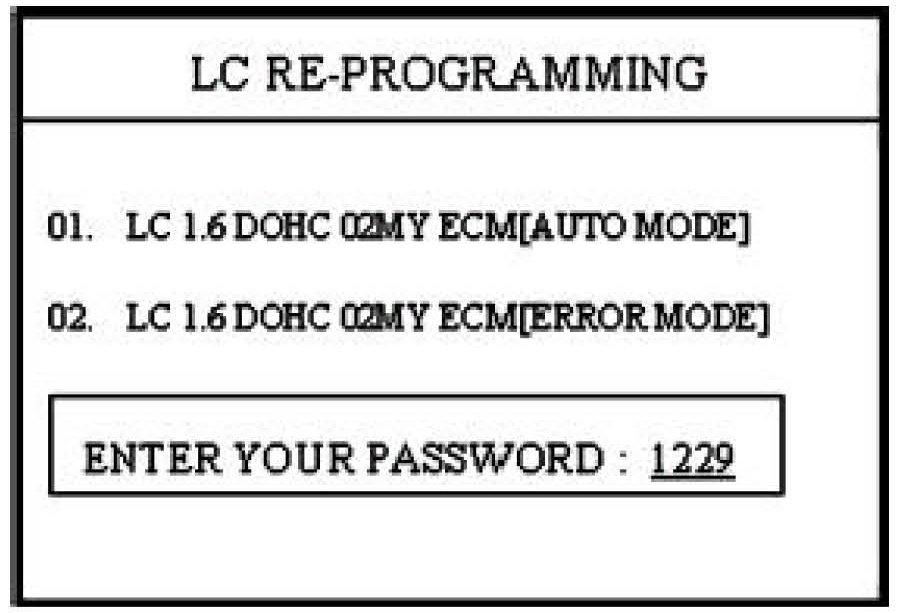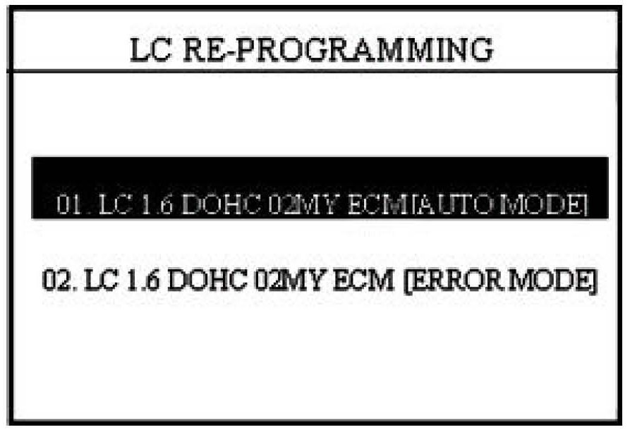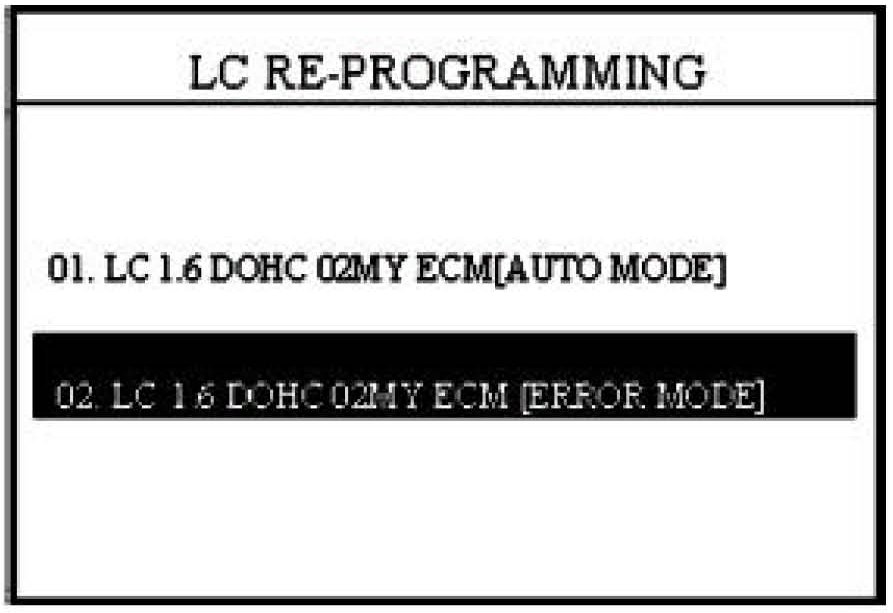 In the event menu option "01. LC 1.6 DOHC 02MY ECM[AUTO MODE]" fails to download the new ECM program, option "02. LC 1.6 DOHC 02MY ECM[ERROR MODE]" must be used.