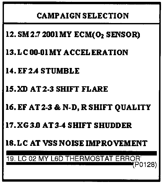 6. Select option "19. LC 02MY 1.6D THERMOSTAT ERROR (P0128)" and press ENTER.