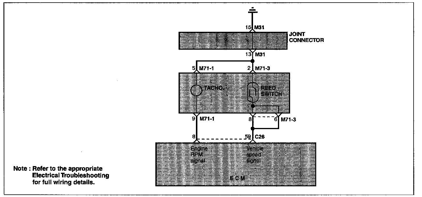 The vehicle speed sensor is a reed switch that is built into the speedometer. The sensor converts the transaxle gear revolutions into a pulse signal which is sent to the ECM.
