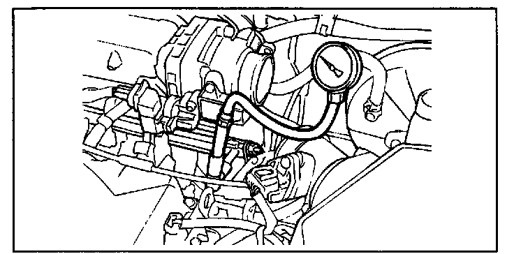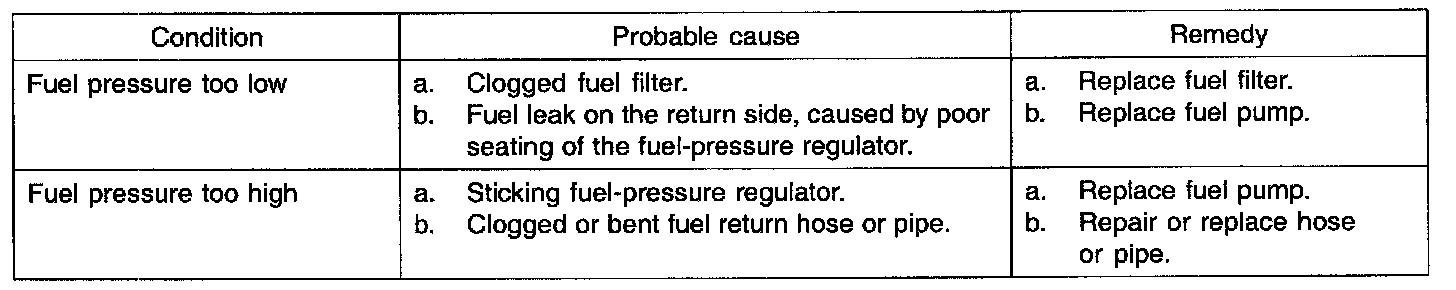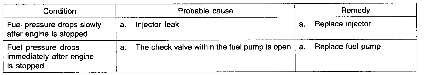 10. Stop the engine and check for a change in the fuel pressure gauge reading, which should hold for approximately 5 minutes. If the gauge indication drops, observe the rate of drop. Determine and remove the causes according to the table.