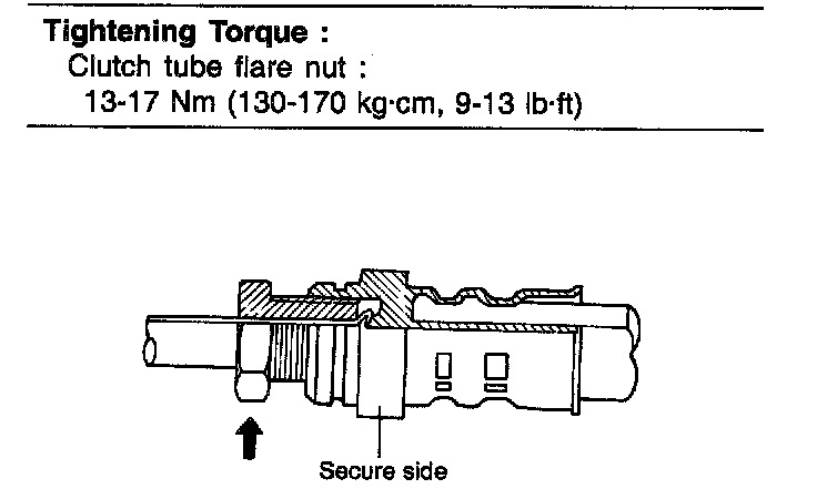 Clutch tube flare nut: 13 - 17 Nm (130 - 170 kg.cm, 9 - 13 ft. lbs.)