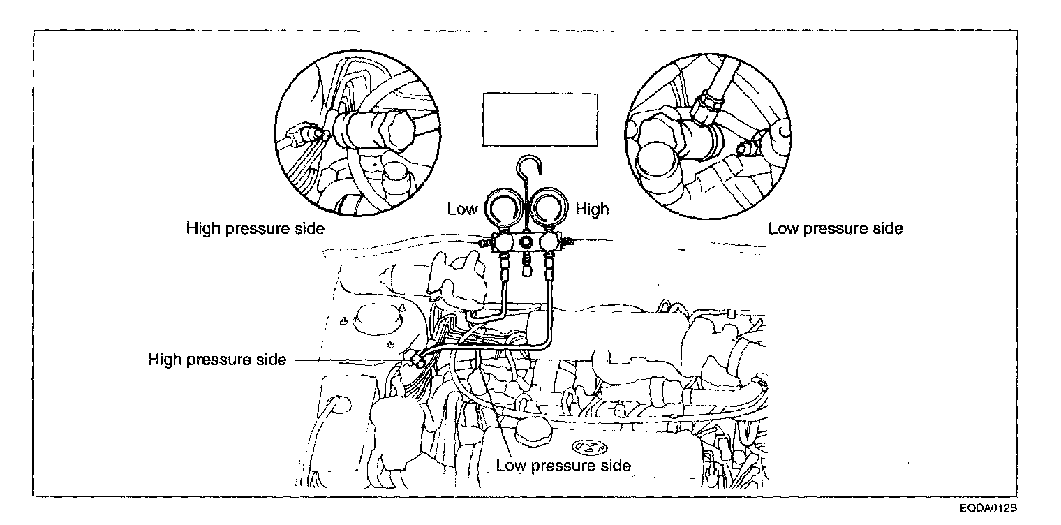 2. Install charging hoses of gauge set to service ports. Connect the low pressure hose to the low pressure service port in the suction pipe and the high pressure hose to the high pressure service port in the discharge hose.