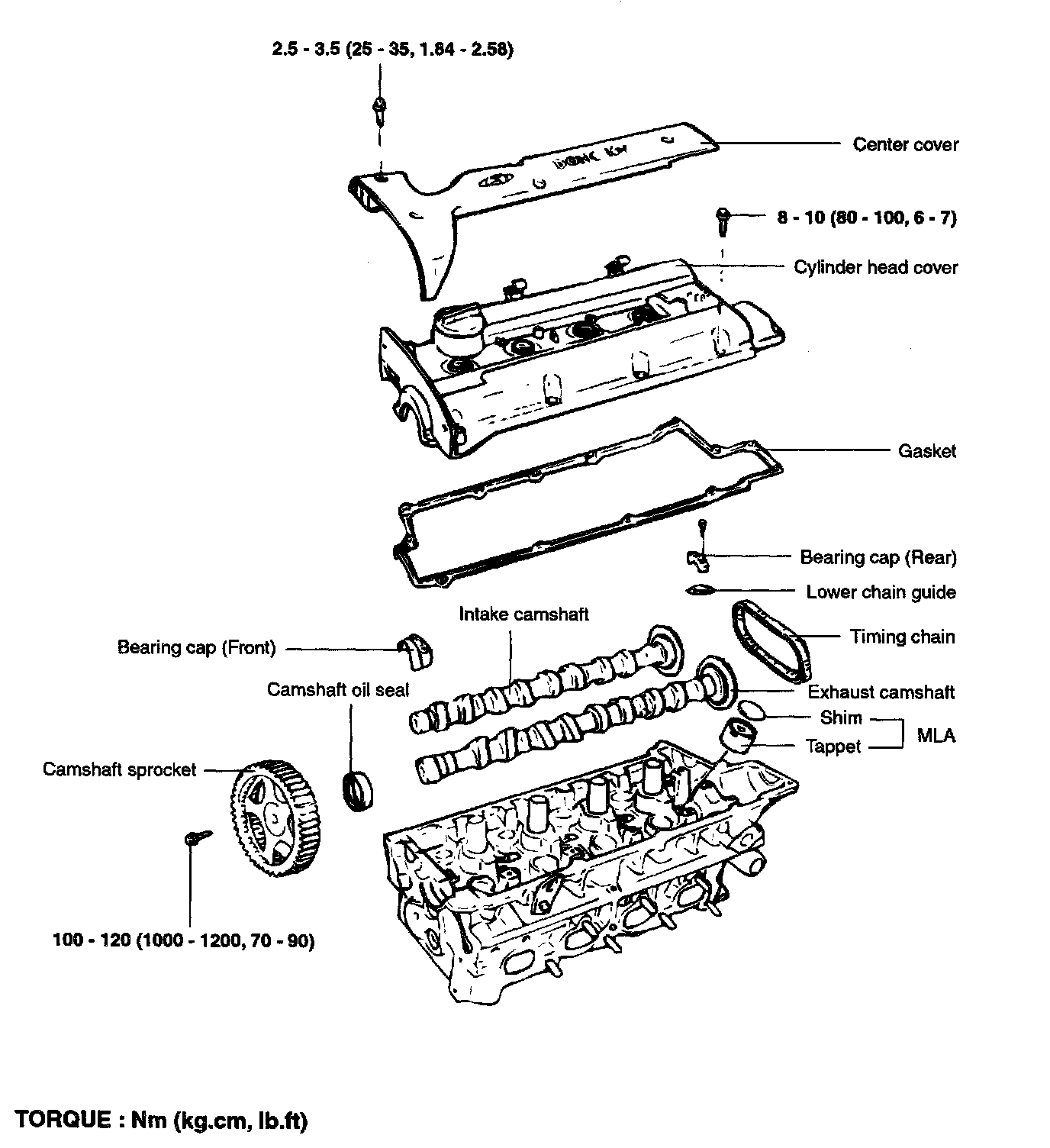 Camshaft sprocket bolt 100 - 120 Nm (1000 - 1200 kg.cm, 74 - 89 ft. lbs.)