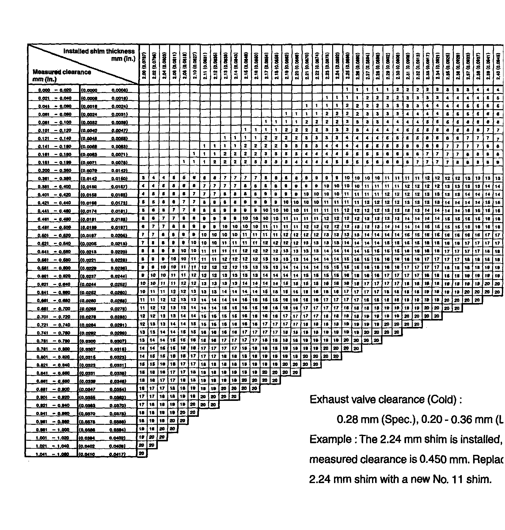 Exhaust: 0.20 - 0.36 mm (0.0079 - 0.0142 inch)