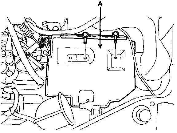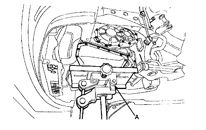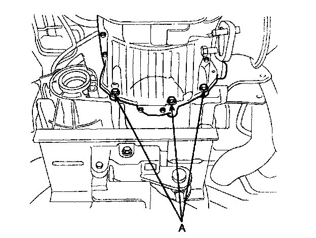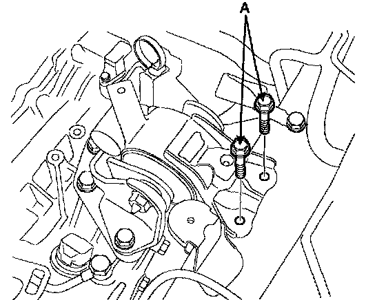 11. Remove the start motor mounting bolts and the transaxle mounting to the engine bolts(A).