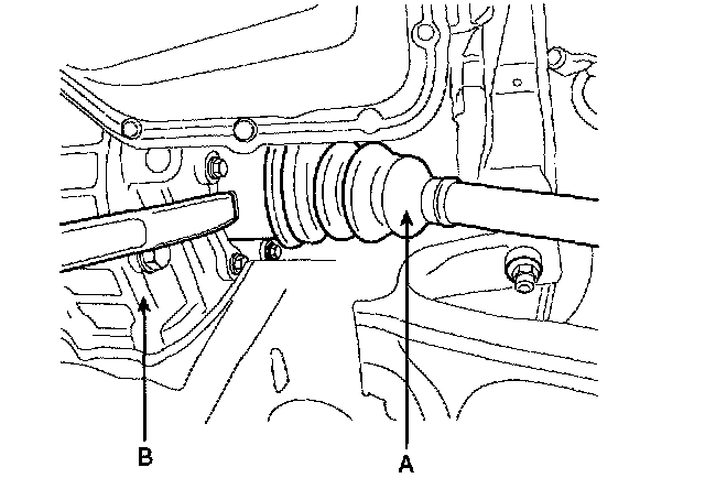 23. Remove the drive shaft(A) from the transaxle(B).