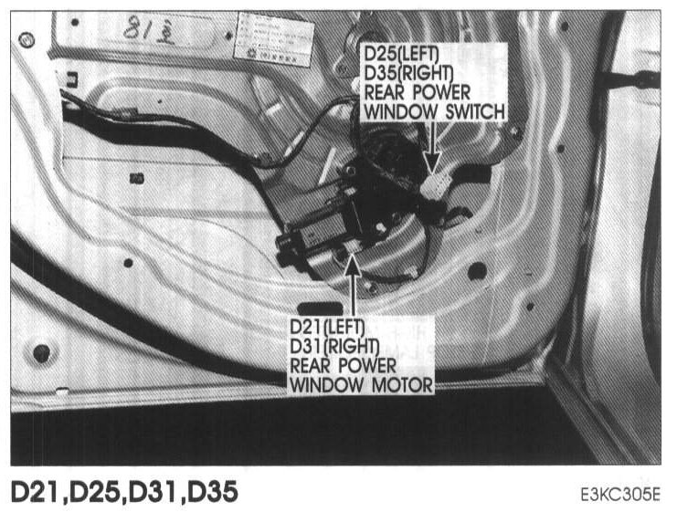 D21(Left), D31(Right) Rear Power Window Motor, D25(Left), D35(Right) Rear Power Window Switch: