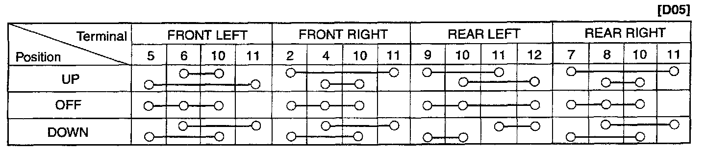 2. Check for continuity between the terminals. If continuity is not as specified in the table, replace the power window switch.