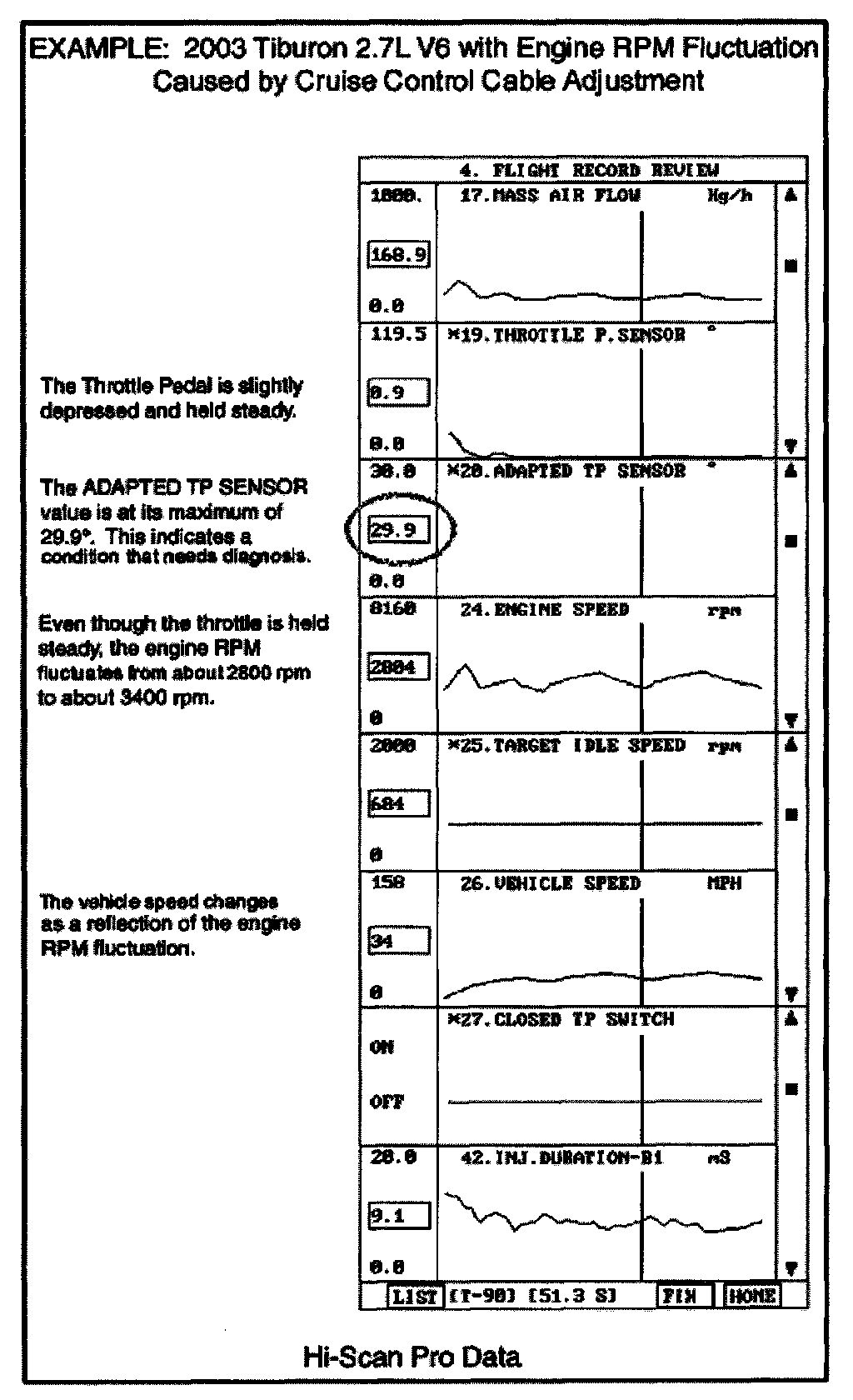 ^ The TPS Value (as displayed by the Hi-Scan Pro in the Current Data Menu) does not increase until the throttle pedal has been depressed about 25% of its normal travel.