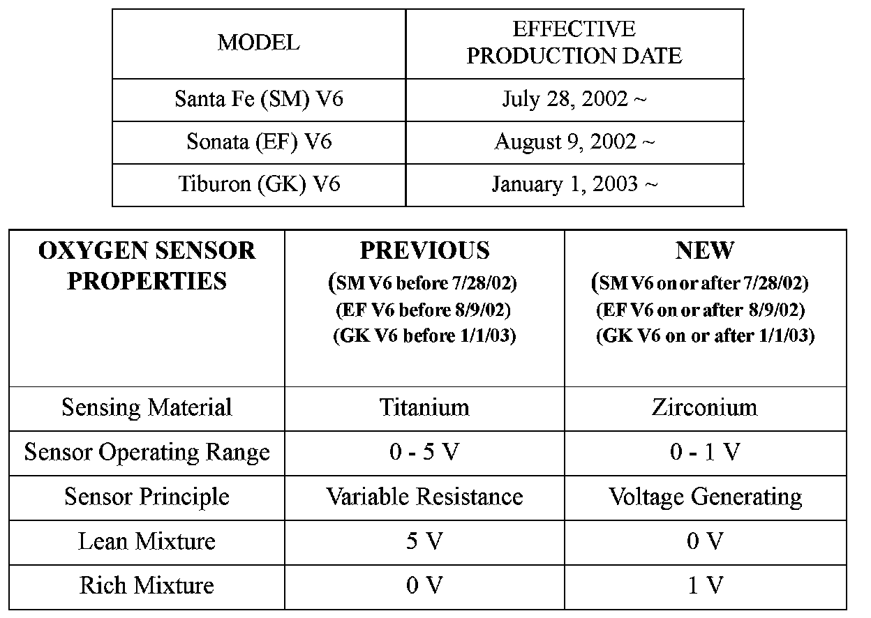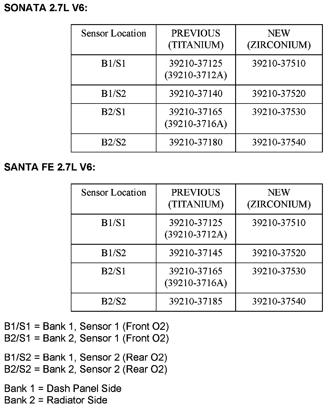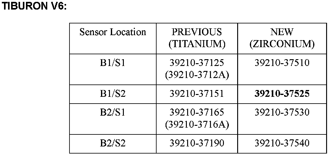 The new B1/S2 02 Sensor part number is unique to the Tiburon V6; otherwise, all other new 02 Sensor part numbers are the same as the Santa Fe 2.7L V6 and Sonata 2.7L V6.