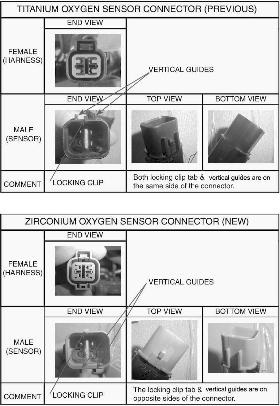 The 02 sensor connectors of the Titanium and Zirconium 02 sensors are different to prevent installation of the incorrect sensor type.