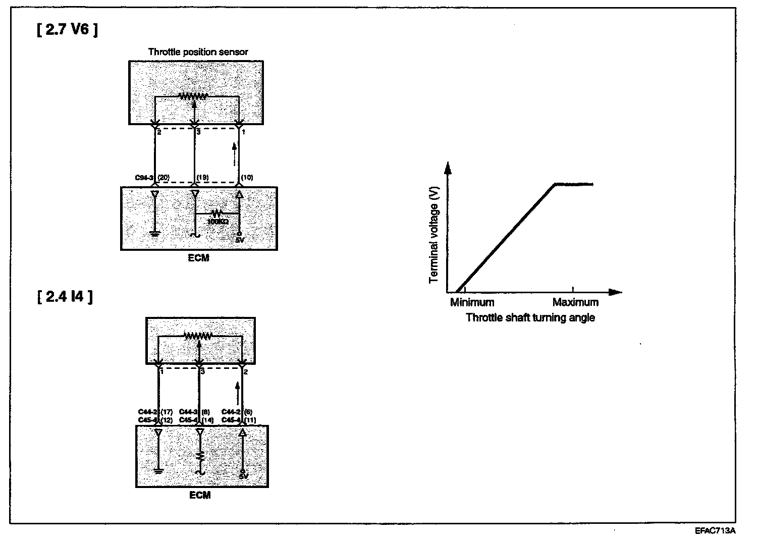 The TP Sensor is a variable resistor type that rotates with the throttle body shaft to sense the throttle valve angle. As the throttle shaft rotates, the output voltage of the TP Sensor changes. The ECM detects the throttle valve opening based on voltage change.