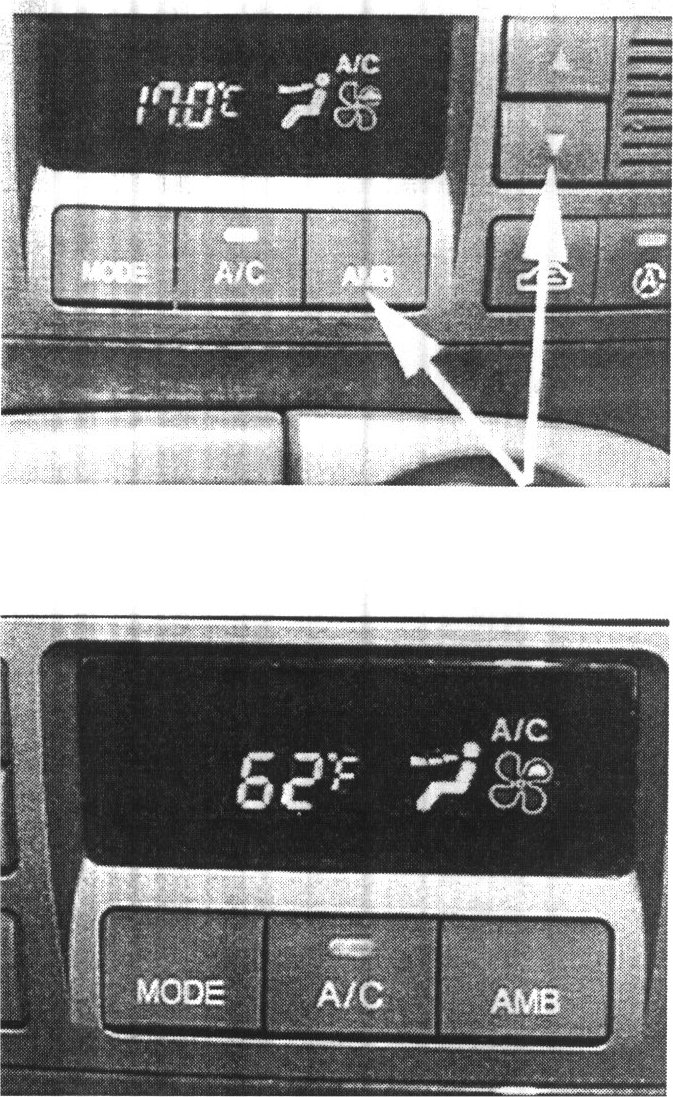 After the "short connector" has been fully seated, turn the ignition switch to the run position to activate the HVAC display. Then press both the "AMB" and the blue temperature control buttons simultaneously for approximately 3 seconds. The display will switch from Centigrade to Fahrenheit as the 2 buttons are being pressed.