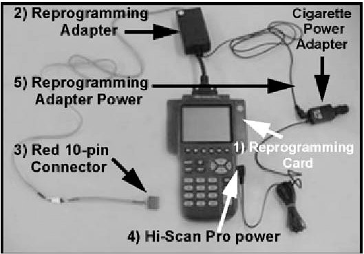 1. Remove the current system software card from the Hi-Scan Pro and insert the reprogramming software card into the Hi-Scan Pro top slot.2. Connect the reprogramming adapter to the Hi-Scan Pro.