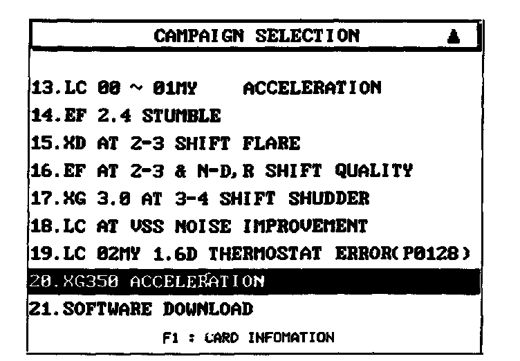 NOTE:In the event that option "01. XG350 ACCELERATION [AUTO MODE]" fails to download the new ECM program, option "02. XG350 ACCELERATION (ERROR MODE]" must be used.