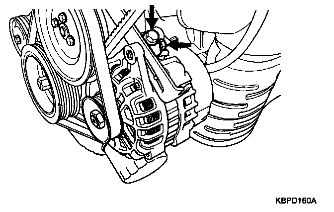 3. Loosen the belt tension adjusting bolt and remove the mounting bolt.