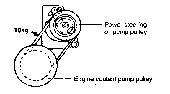 CHECKING POWER STEERING BELT TENSION1. Press the V belt, applying a pressure of 98 N (10 kg, 22 lbs.) at the specified point and measure the deflection to confirm that it is within the standard value.