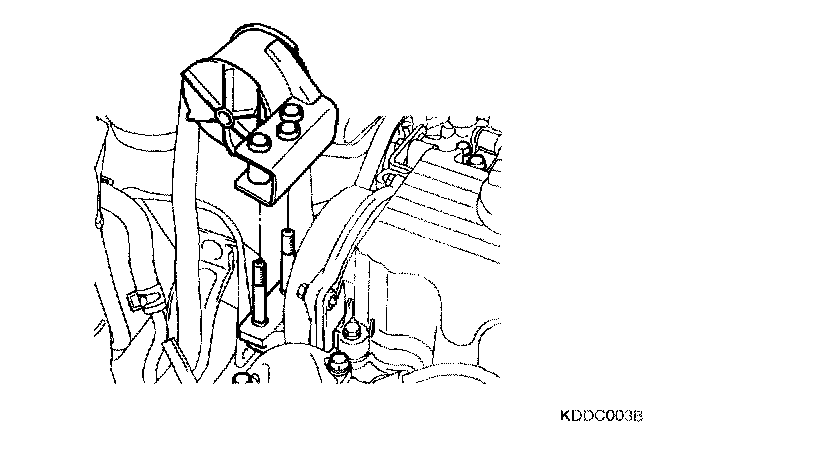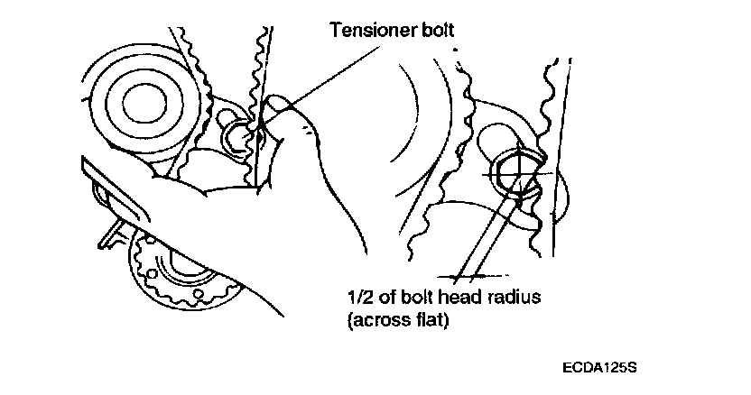 13. Check the tension of the timing belt. When the tensioner and the tension side of the timing belt are pushed in horizontally with a moderate force [approximately 49N (11 lb)], the the timing belt log end is approximately half of the tensioner mounting bolt head radius (cross flats) away from the bolt head center.