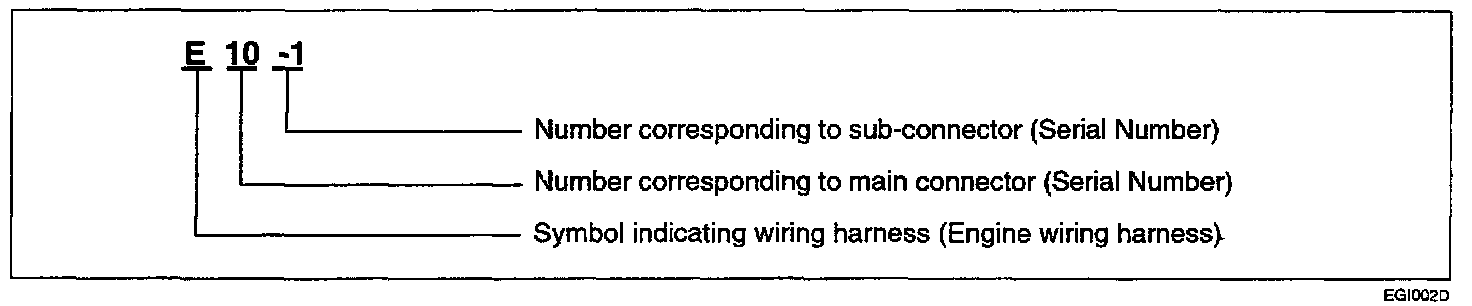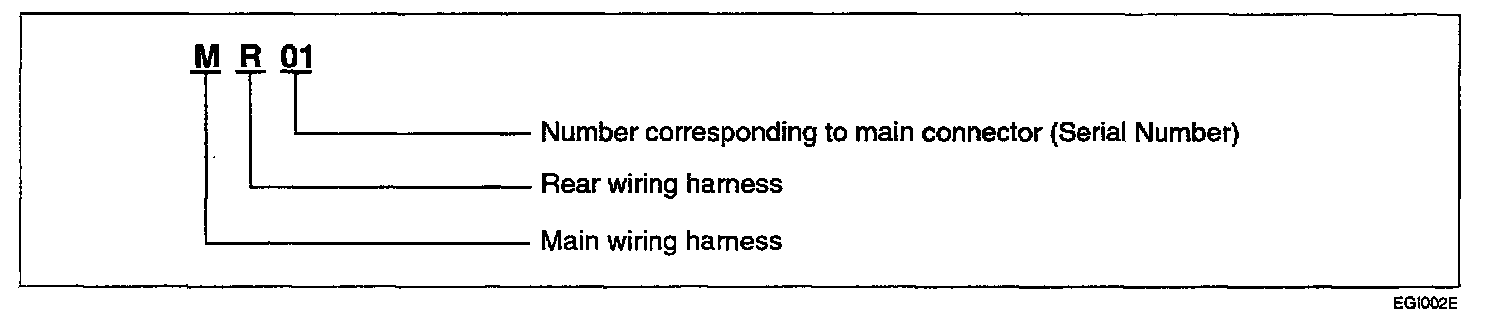 A connector identification symbol consists of a wiring harness location classification symbol corresponding to a wiring harness location and number corresponding to the connector. These connector locations can be found in the HARNESS LAYOUTS.For example