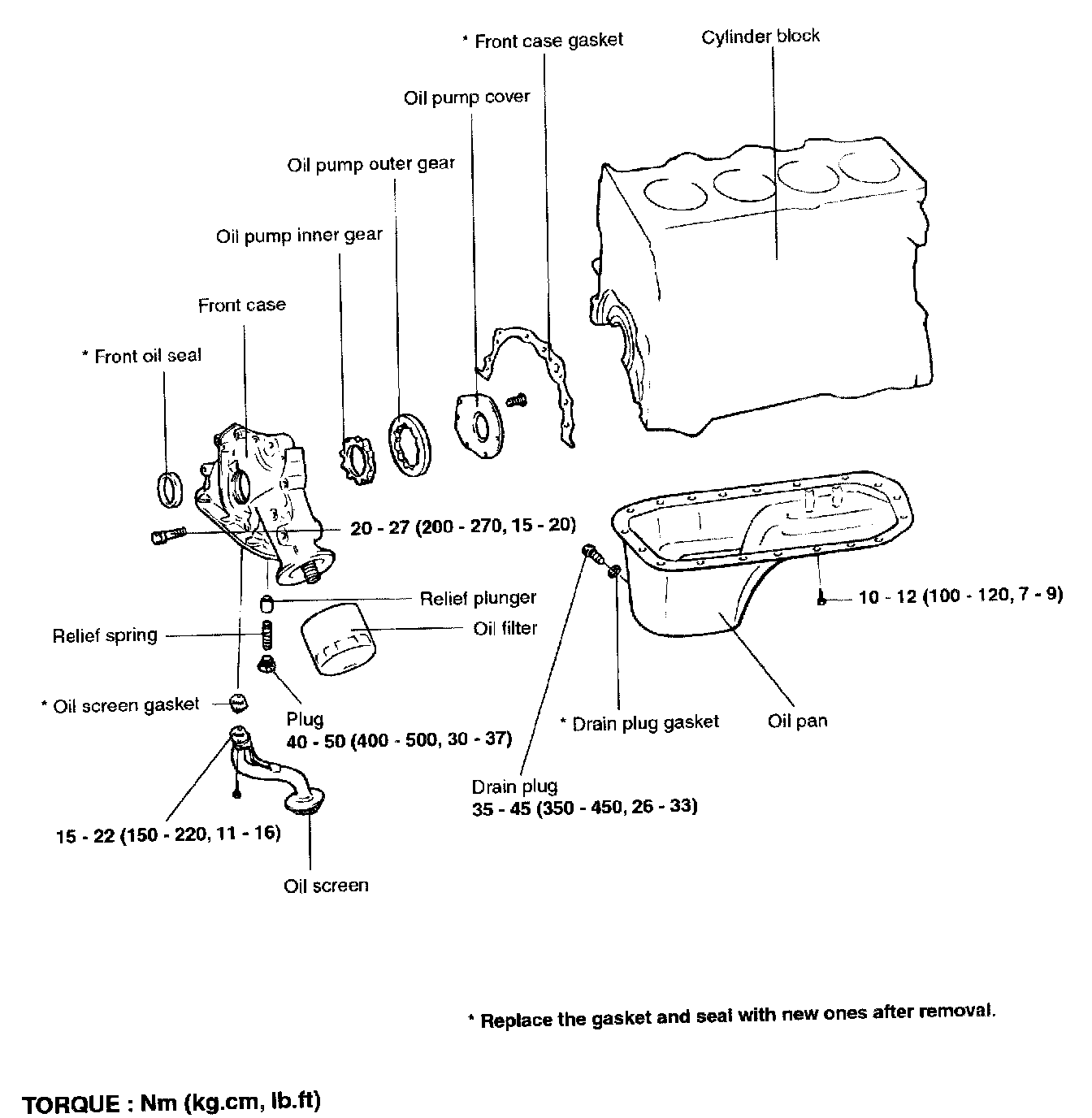 Oil pan bolt:.........10 - 12 Nm (100 - 120 kg-cm, 7 - 9 ft. lbs.)
