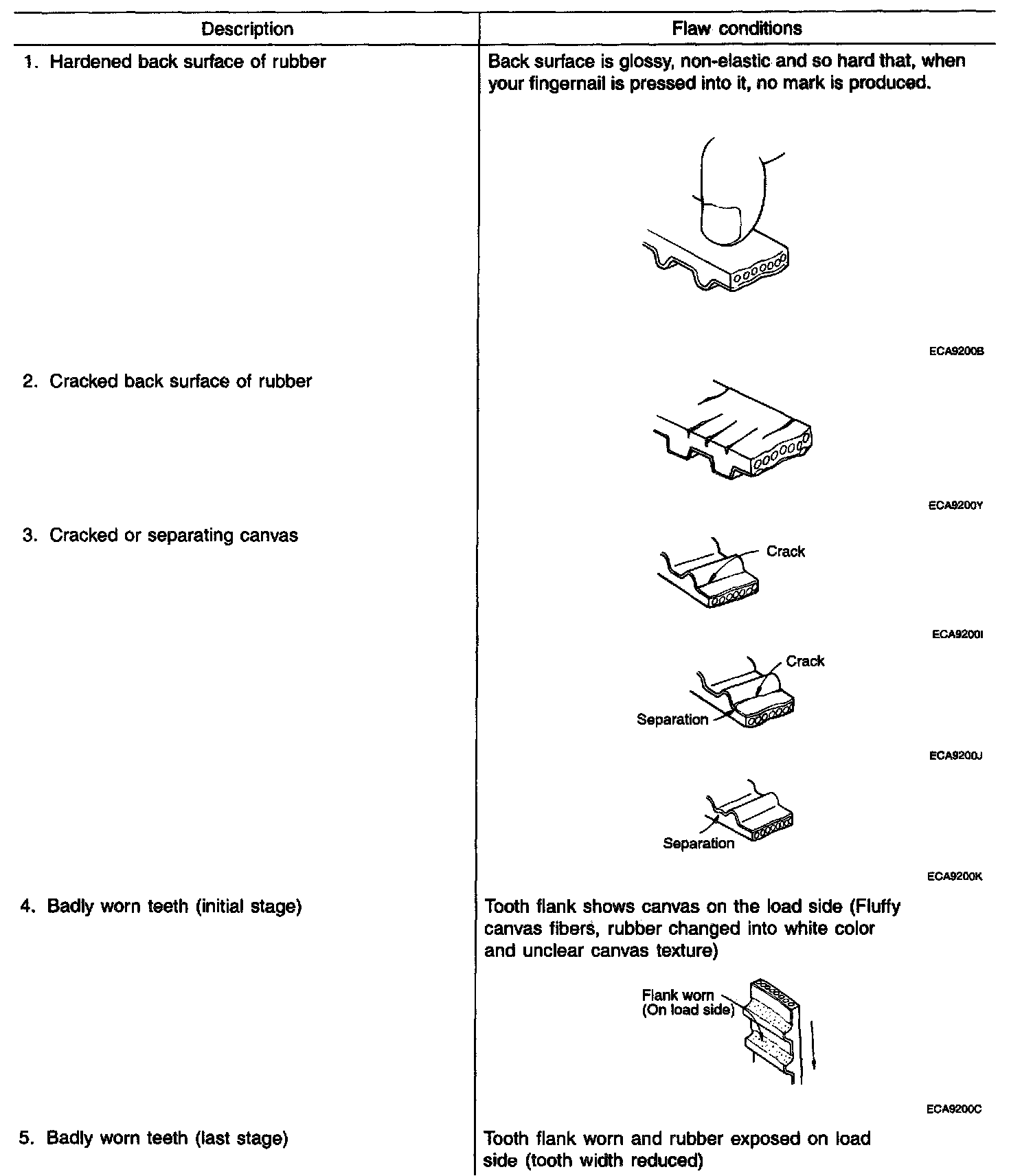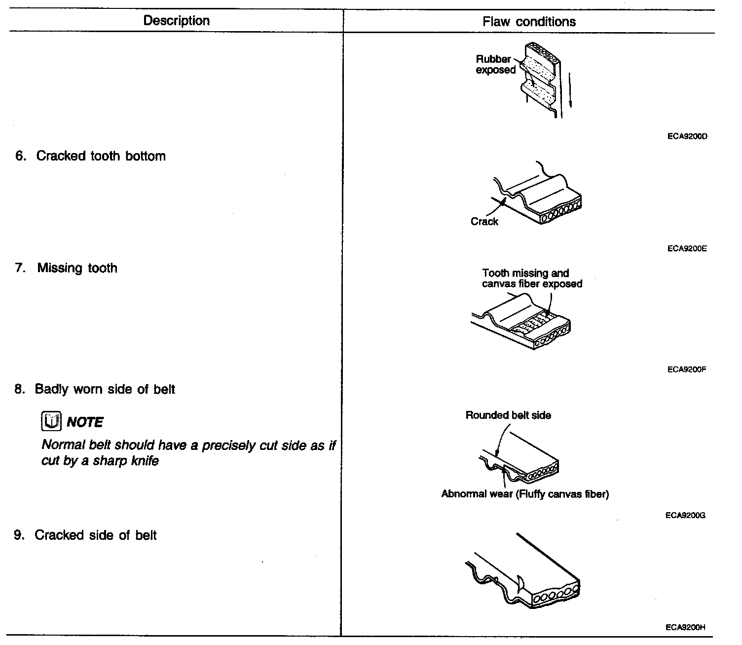 2. When the engine is overhauled or belt tension adjusted, check the belt carefully. If any flaws are evident, replace the belt.