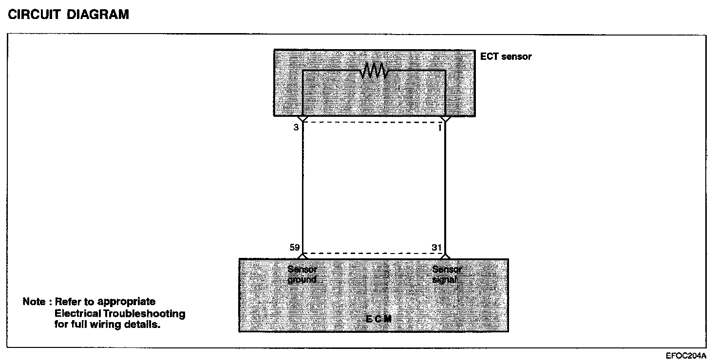 The engine coolant temperature sensor, located in the engine coolant passage of the cylinder head. It detects the engine coolant temperature and relays signals to the ECM. It employs a thermistor which is sensitive to changes in temperature. The electric resistance of a thermistor decreases in response to temperature rise. The ECM judges engine coolant temperature by the sensor output voltage and provides optimum fuel enrichment when the engine is cold.