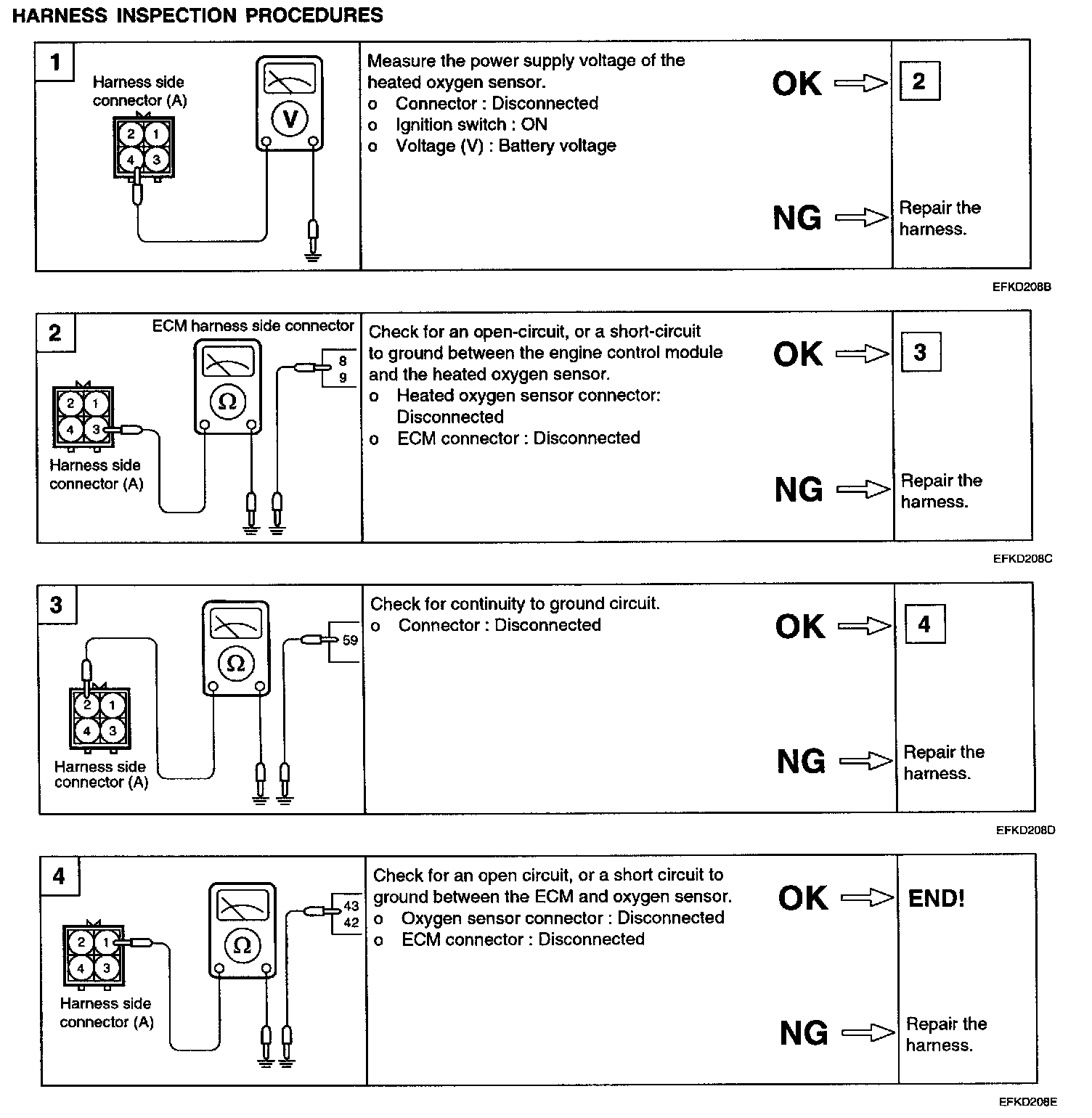 NOTE: If you release the accelerator pedal suddenly after engine running about 4000 rpm, fuel supply will stop for short period and the O2 sensor service data in the HI-SCAN (Pro) will display values 200 mV or lower. When you suddenly press on the accelerator pedal down, the voltage will reach 600-1000 mV