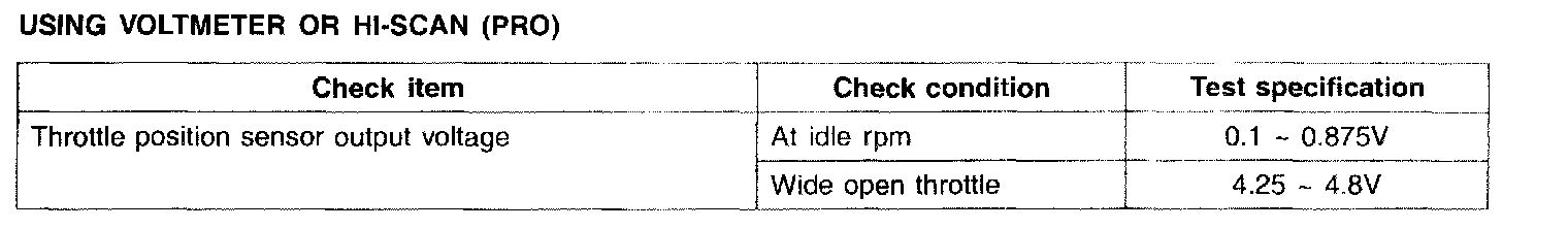 2. If engine idle or acceleration is abnormal, check the TPS connector. (When the TPS connector is not connected properly, the current data on HI-SCAN (Pro) can show that the idle state remains off, although the accelerator pedal is released. This results in the improper idle or acceleration.)
