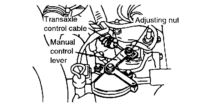 6. Gently pull the transaxle control cable in the direction of the arrow, then tighten the adjusting nut.