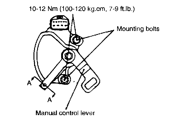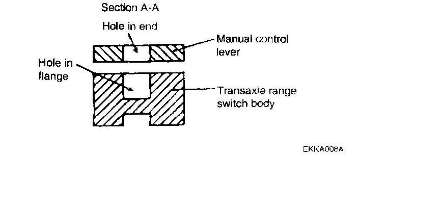4. Loosen the transaxle range switch body mounting bolts and then turn the transaxle range switch body so the hole in the end of the manual control lever and the hole (cross section A-A in the figure) in the flange of the transaxle range switch body flange are aligned.